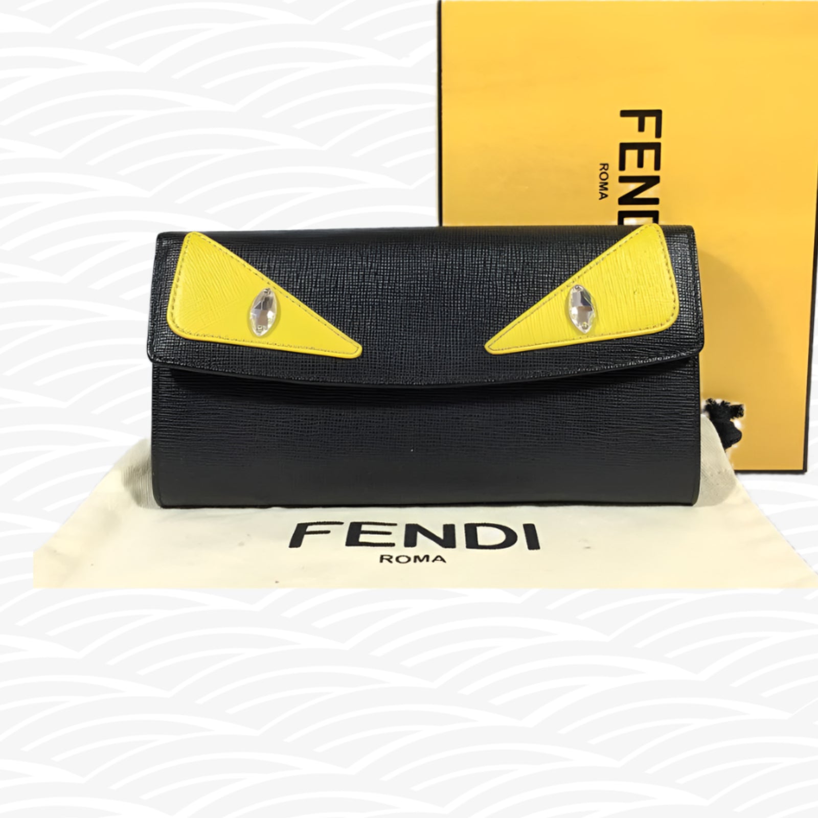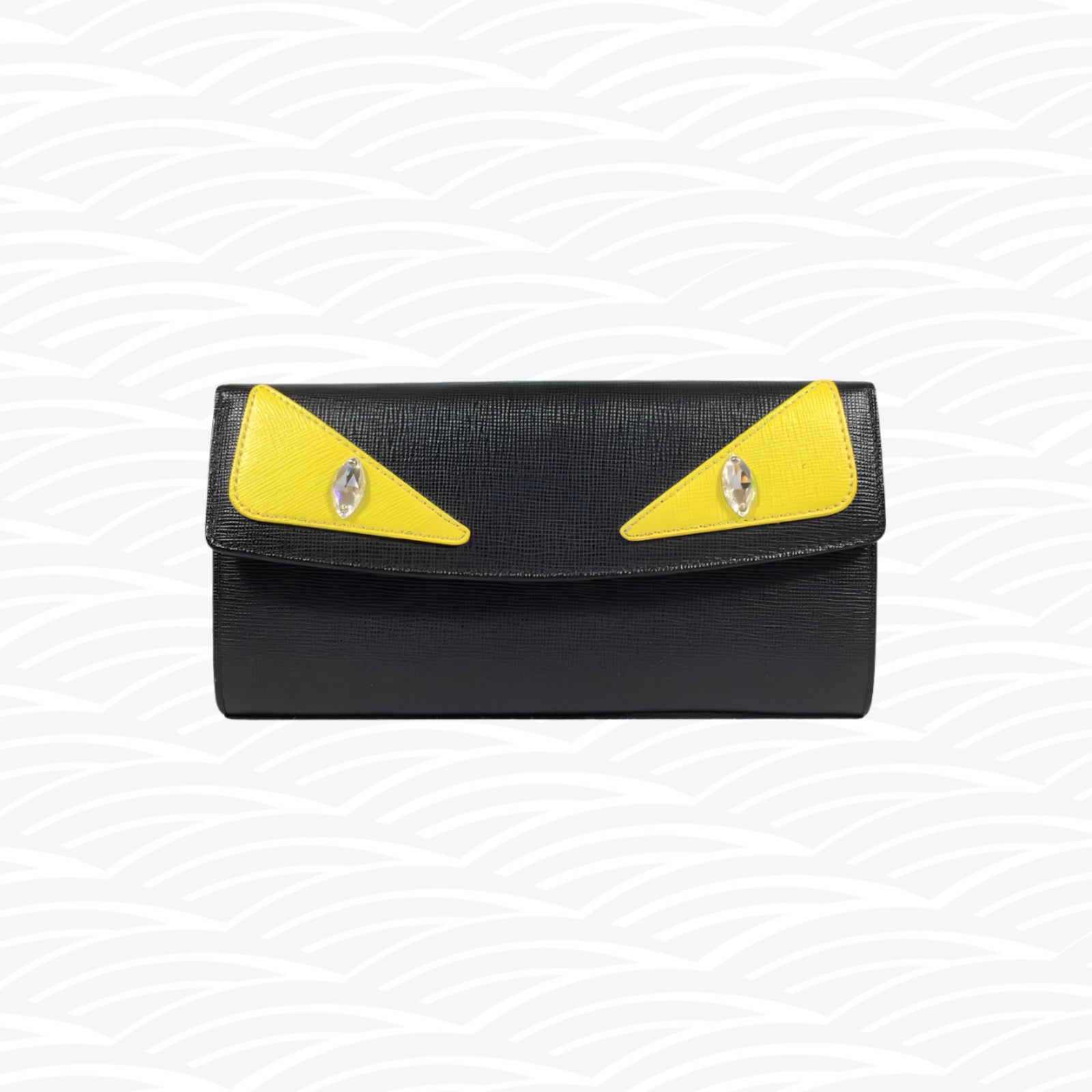 This Fendi Monster Eyes Continental Wallet is a sophisticated and stylish choice. Made of high-quality black leather, it features a unique 'Monster Eyes' design on the flap. With multiple card slots and a zipped pocket, this wallet offers both practicality and luxury. Perfect for the fashion-forward individual.